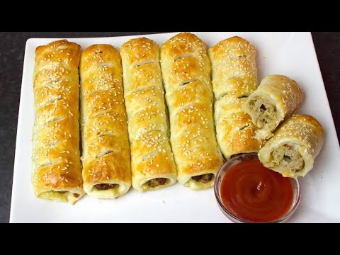 3. Assemble Kababs: Place the seekh kababs on the puff pastry sheet as demonstrated in the video. Roll the puff pastry forward, covering the kababs completely. Cut the rolled puff pastry into the desired size pieces.